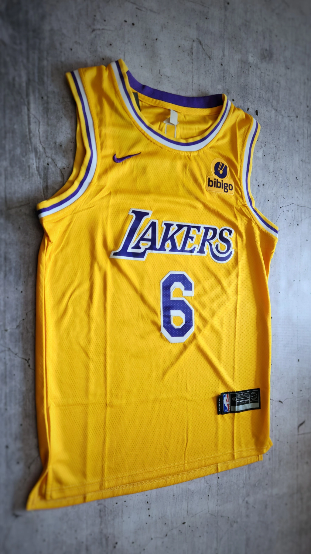 Lleva el espíritu de los Lakers a tu juego con esta impresionante camiseta. Hecha con poliéster de alto nivel, calidad en costuras y estampados y mangas cortas para una comodidad óptima. El color amarillo con detalles violetas y blancos es un diseño moderno que refleja la identidad innovadora de los Lakers. Con el logotipo de los Lakers en el pecho, el número 6 en la espalda y el nombre del jugador "JAMES" bordados. Esta camiseta es un producto de imitación (triple A) importado de china, una réplica exacta de la que usa el equipo en la cancha.