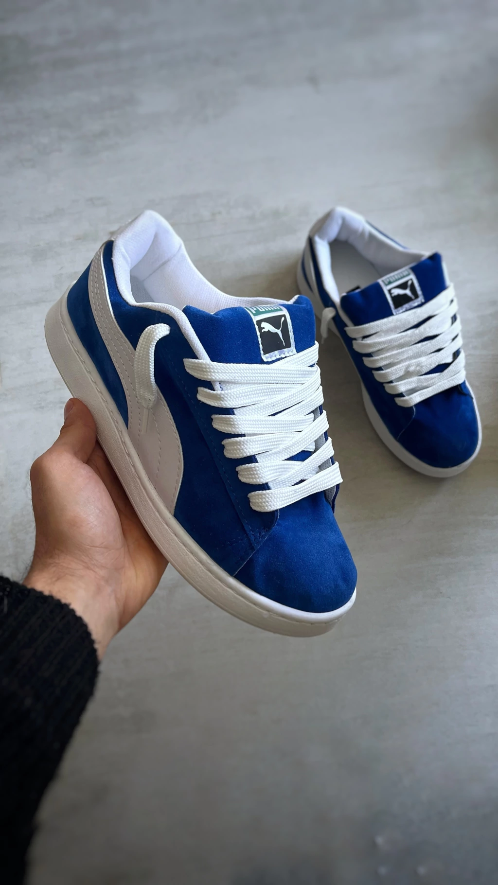 La zapatilla PUMA Suede Azul es una versión del clásico atemporal de PUMA, caracterizada por su distintivo color azul en la parte superior de gamuza. Al igual que otras versiones de las Suede, combina una estética sencilla y retro con comodidad. El elemento más llamativo es su construcción en ante suave de alta calidad en un tono azul y el color de la suela crea un contraste con el azul de la parte superior .Es una zapatilla con una estética clásica y un toque de color distintivo. Conserva la silueta icónica y la comodidad que han hecho de la Suede un referente, convirtiéndola en una excelente opción para quienes buscan un calzado con estilo y personalidad en un color azul llamativo.